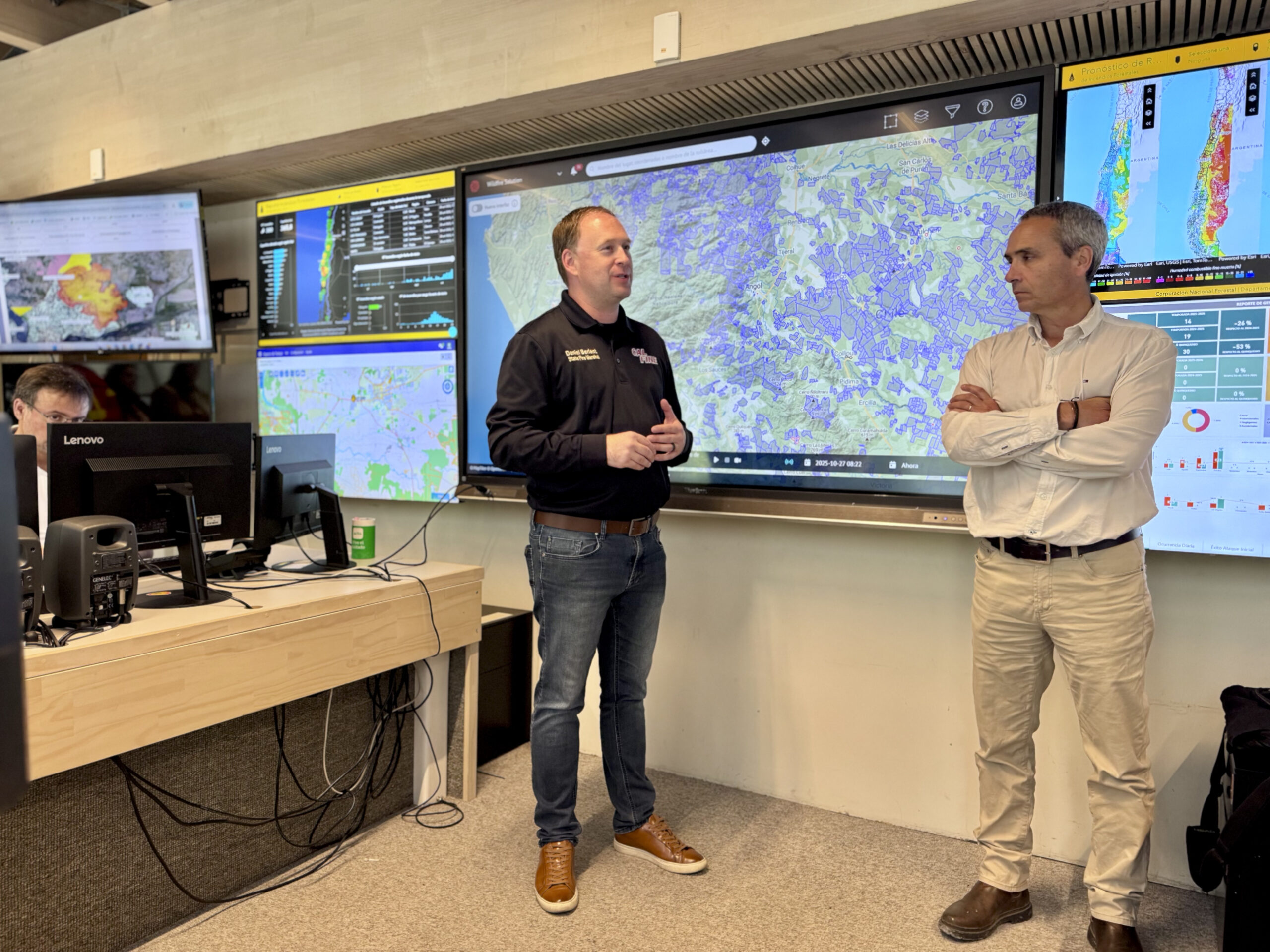 La visita —que se enmarca en una agenda que recorre Santiago, Concepción y Los Ángeles— contempló una reunión técnica en el edificio corporativo de CMPC en Los Ángeles, donde la compañía presentó sus estrategias de prevención y combate de incendios, así como su enfoque en innovación y gestión comunitaria del riesgo.